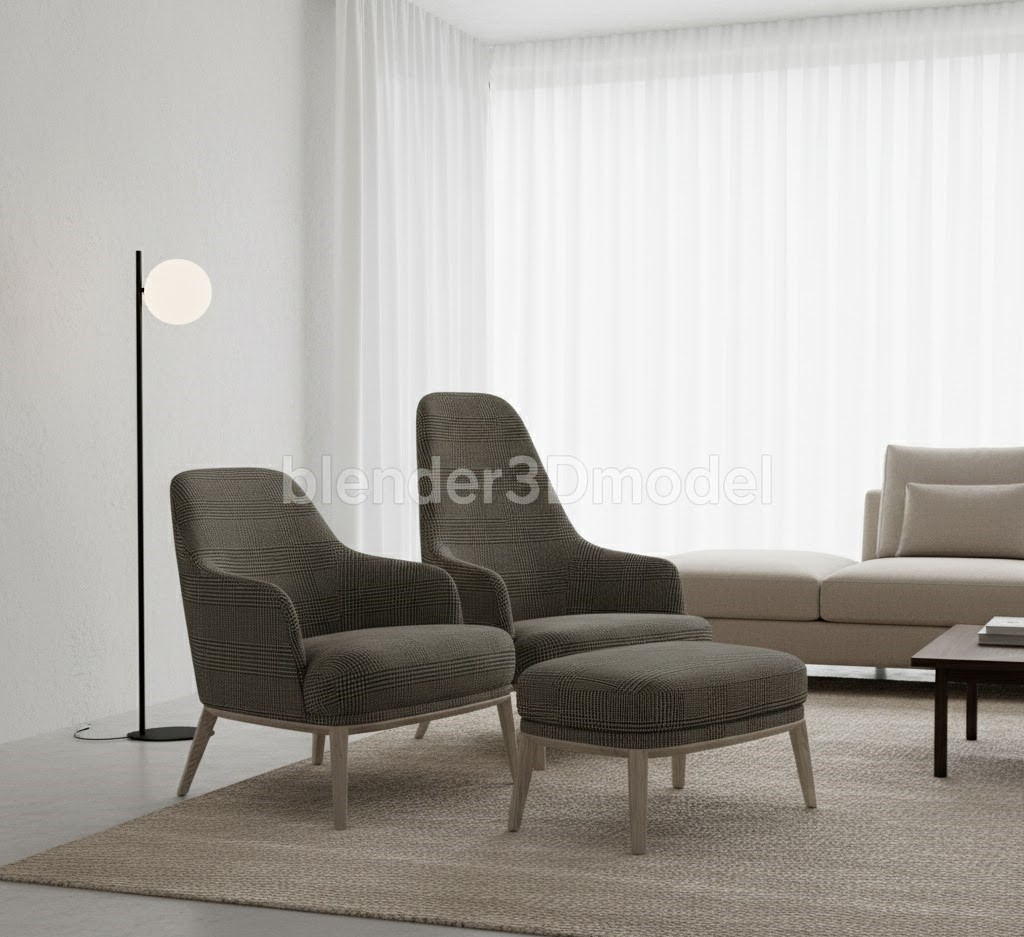 Elegant Plaid Fabric Armchair & Ottoman Set 3D Model (Blender/Cycles